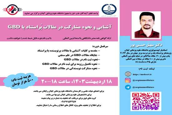 سرفصل دوره: - مقدمه و کلیات آشنایی با مقالات پرنویسنده یا پراستناد - جایگاه مقالات GBD در علم سنجی -نحوه ثبت نام در مقالات GBD - نحوه تکمیل رزومه برای ثبت نام در مقالات GBD - نحوه مشارکت نویسندگی در مقالات