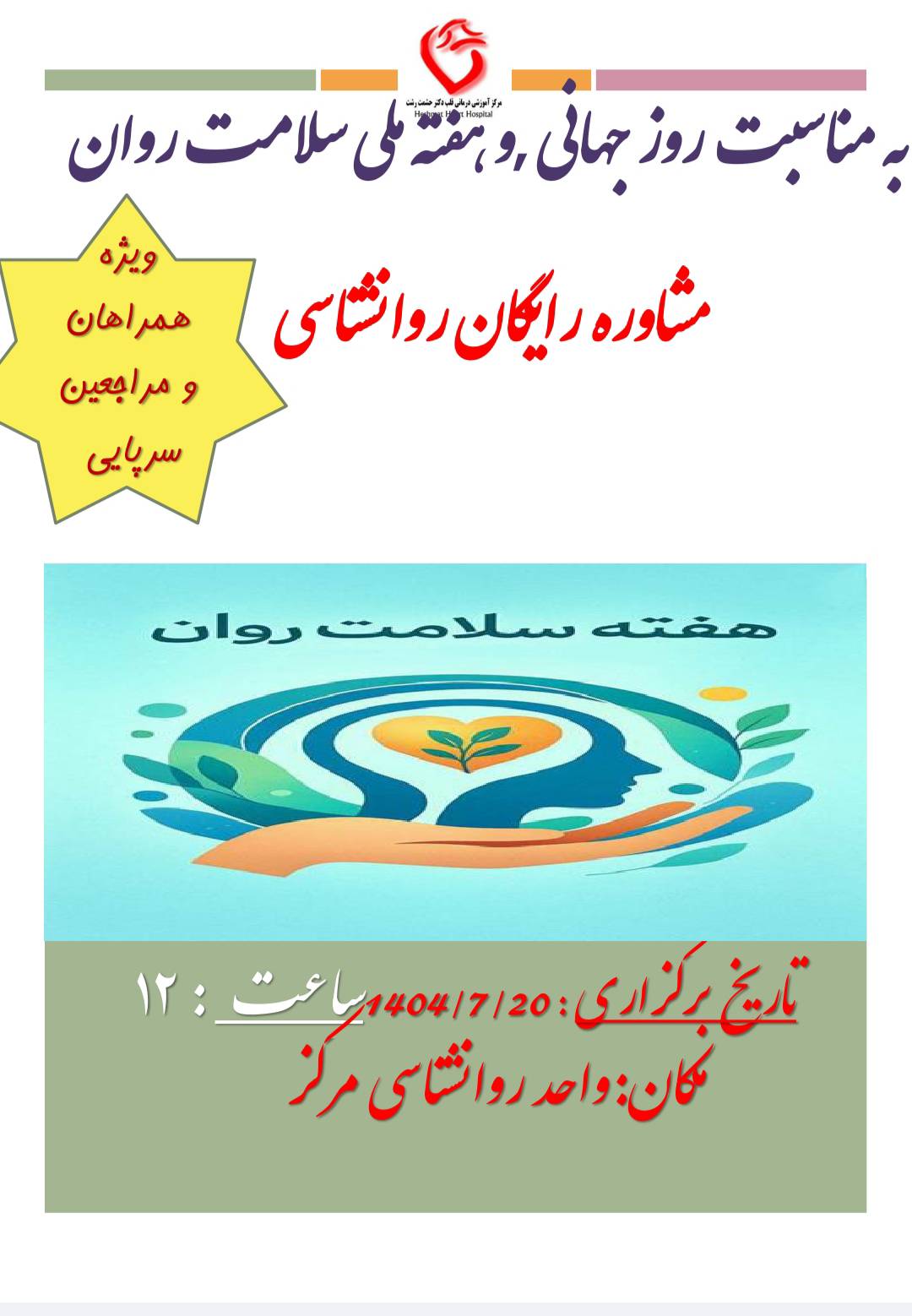 فعالیتهای هفته ملی سلامت روان از 19 تا 25 مهرماه ۱۴۰۴ بر اساس اعلام وزارت بهداشت، درمان و آموزش پزشکی؛  با شعار «دسترسی به خدمات سلامت روان در بحران‌ها و شرایط اضطراری؛ یک اولویت همگانی» در بیمارستان حشمت اجرا شد.