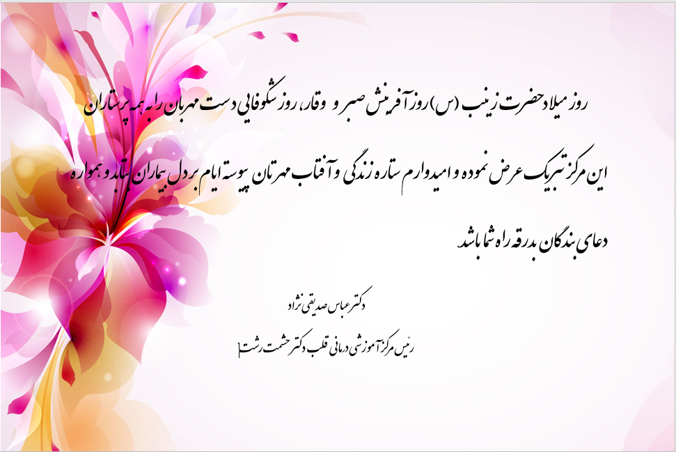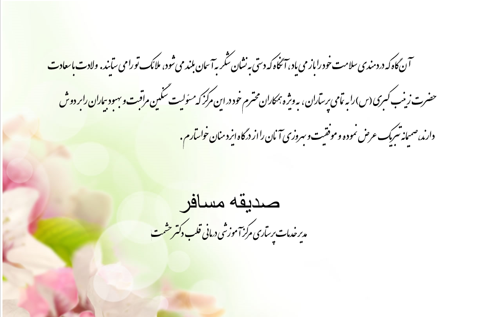 روز میلاد زینب کبری(س)، الگوی شکیبایی، ستاره درخشان ایمان، مقاومت و ارزش های والای انسانی را به همه پرستاران عزیز تبریک و تهنیت عرض می کنیم؛ به همه پرستارانی که از پس ابر حیا و عفّت باران عاطفه باریدند و به نور ایمان درونشان گرمای زندگی در کالبد جامعه جاری کردند.